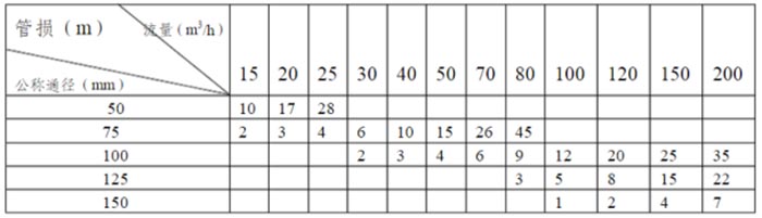 其中h項的計算比較麻煩,下表1列出了每100米的鋼管管路損失揚程(米)供參考。